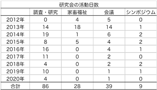 研究会独自の調査の他に、他の研究グループとの共同作業の実施や、現地に立ち入りを希望する研究者の仲介や同行を行ったり、解剖材料の提供を行ってきました。